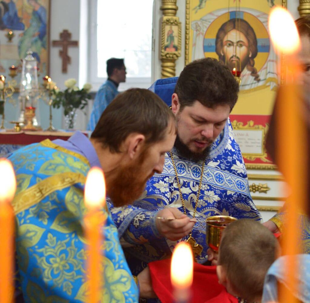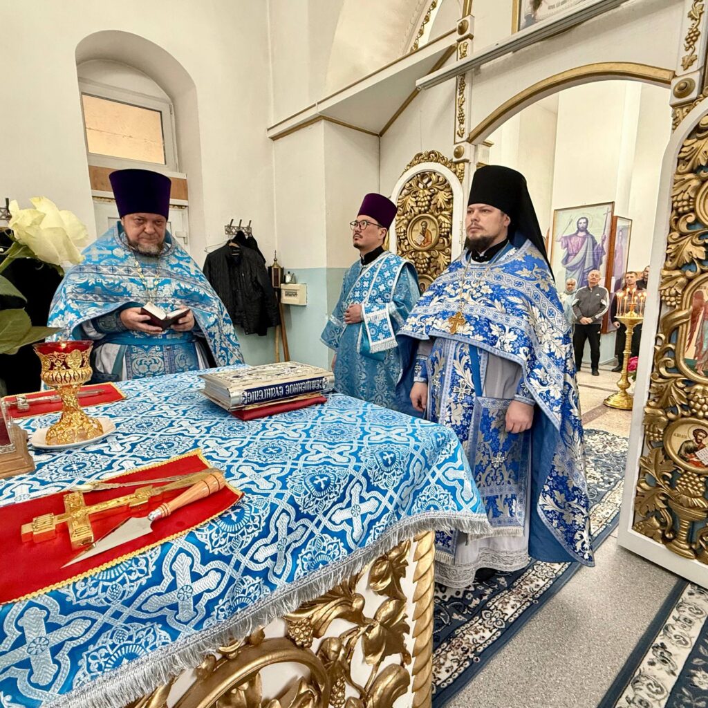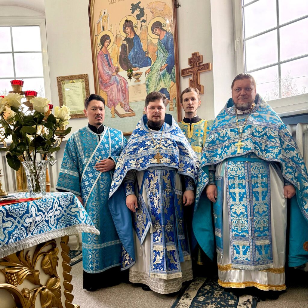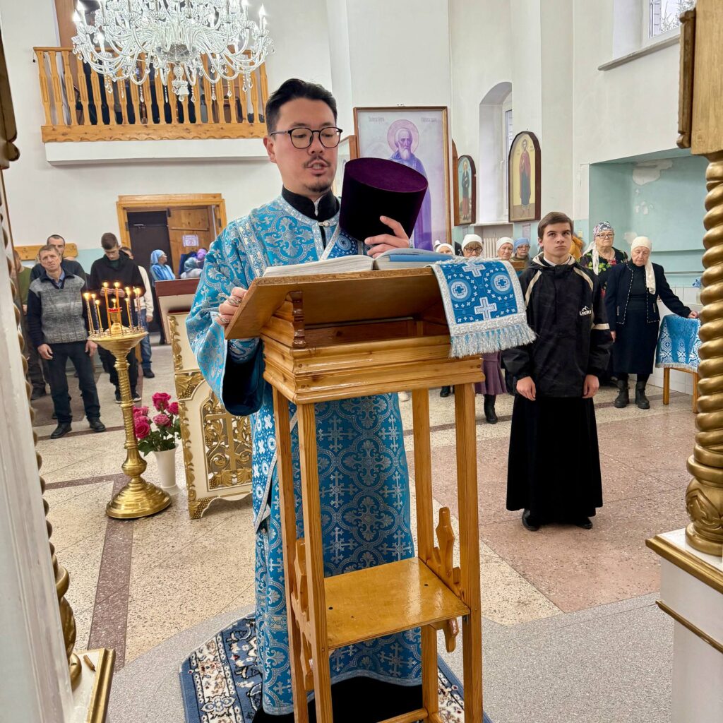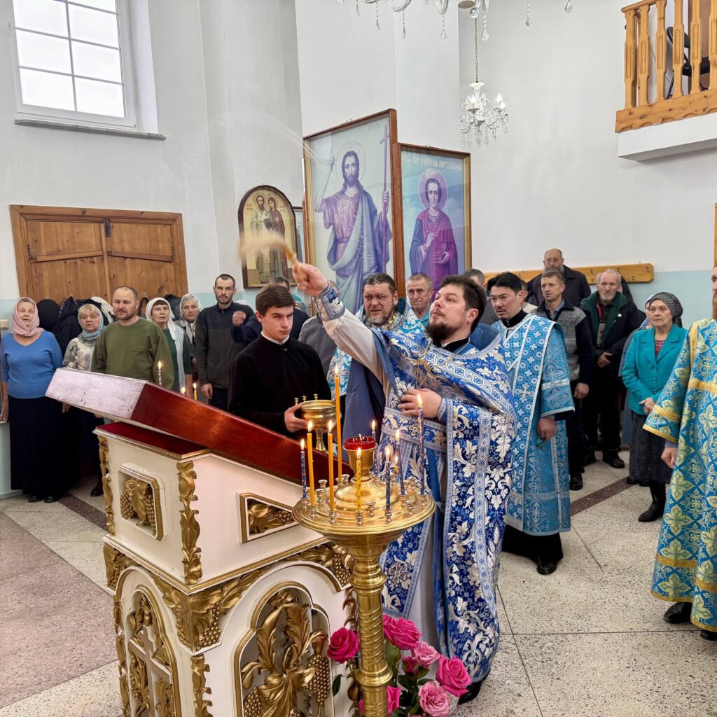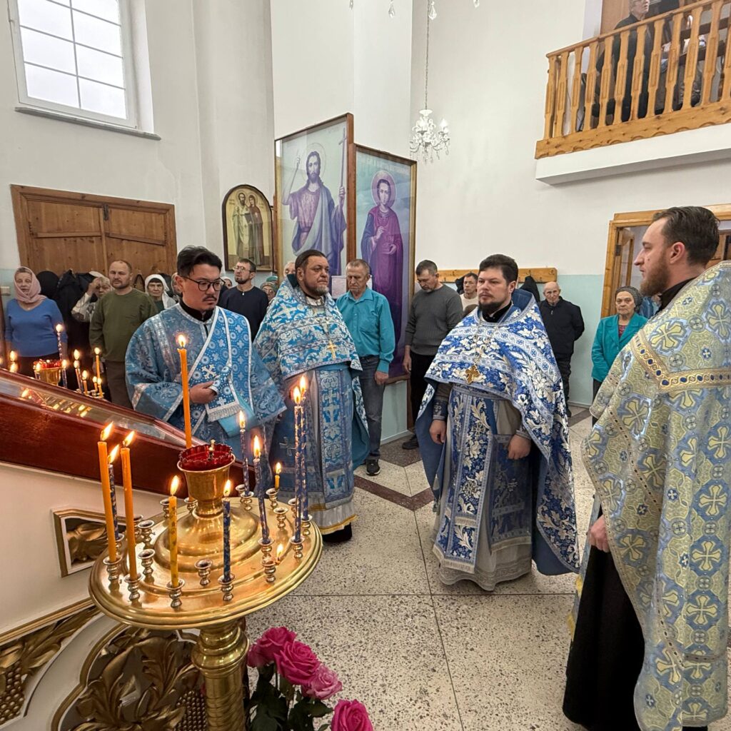 Отцу благочинному сослужили: настоятель Казанского храма поселка Усть-Таловка иерей Георгий Гуцалов, секретарь епархии диакон Илия Кван и клирик Свято-Покровского собора г. Усть-Каменогорск диакон Кирилл Нарушин.